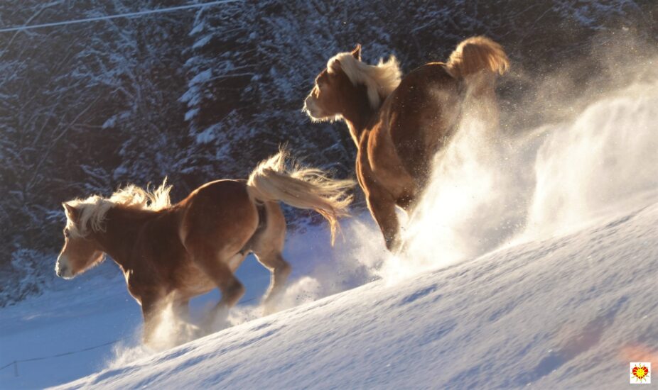 Botschaft der Sonne im Herzen mit Pferden im Schnee im Salzburger Seenland